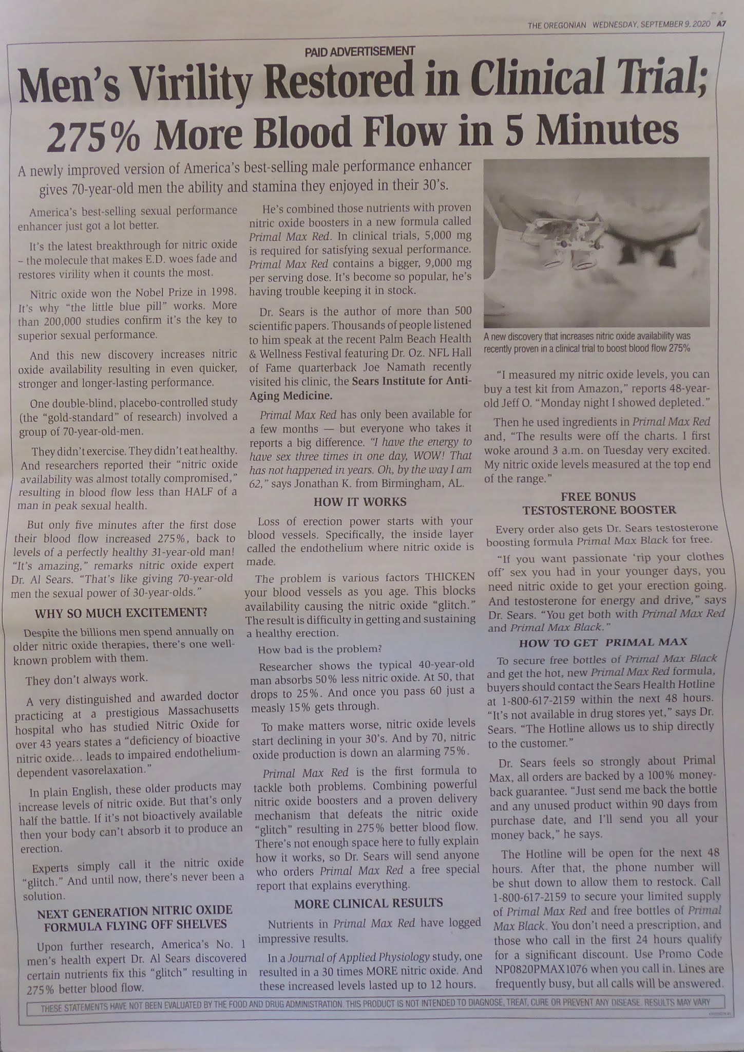 I’m looking at a full-page ad here for Primal Max Red, the latest and greatest entry in the swelling male sexual performance market. Says here there have been over 200,000 studies of the enhancer, and that dude says it totally works. PMR results in a quicker, stronger, and longer-lasting “performance.”