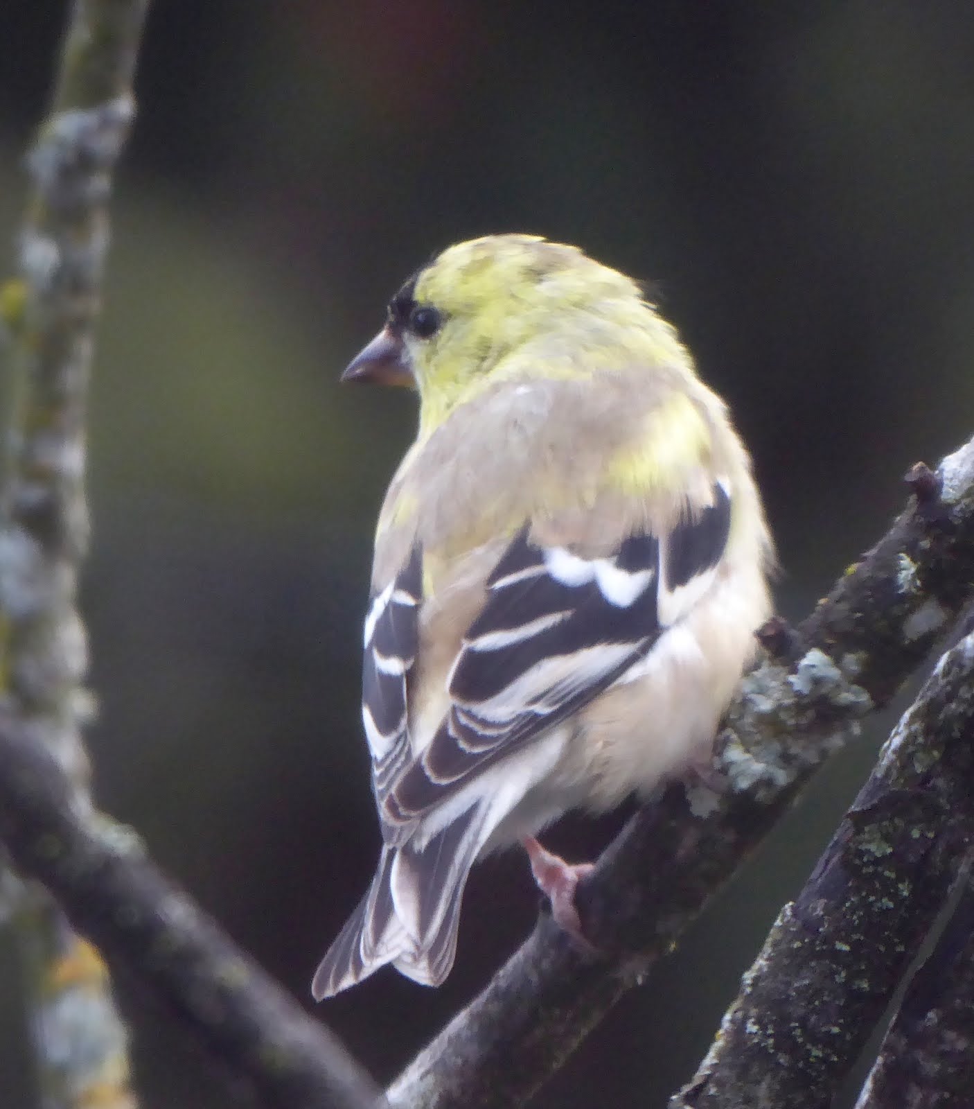 But when they molt, most of them don’t just drop their drawers and haul on a new outfit. It happens feather by feather: the old one gets pushed out, and the new one grows in. And so that nice even beige color of the male winter goldfinch goes spotty and mottly for a while before it’s finally all Hey-Baby yellow.